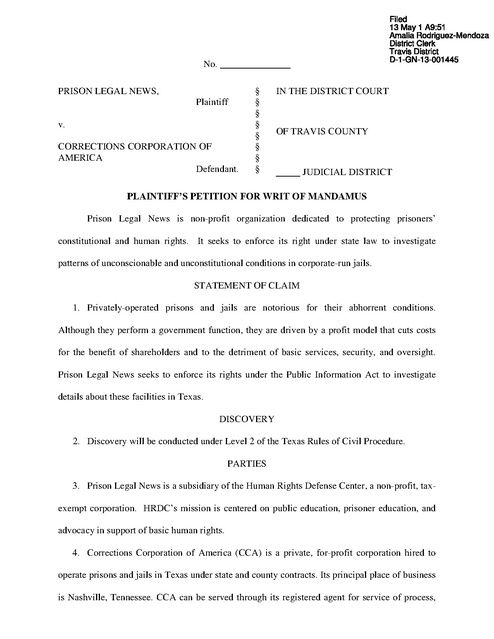 Filed 13 May 1 A9:51 Amalia Rodriguez-Mendoza District Clerk Travis District D-1-GN-13-001445 No. PRISON LEGAL NEWS, Plaintiff v. CORRECTIONS CORPORATION OF AMERICA Defendant. § § § § § § § § IN THE DISTRICT COURT OF TRAVIS COUNTY JUDICIAL DISTRICT PLAINTIFF’S PETITION FOR WRIT OF MANDAMUS Prison Legal News is non-profit organization dedicated to protecting prisoners’ constitutional and human rights. It seeks to enforce its right under state law to investigate patterns of unconscionable and unconstitutional conditions in corporate-run jails. STATEMENT OF CLAIM 1. Privately-operated prisons and jails are notorious for their abhorrent conditions. Although they perform a government function, they are driven by a profit model that cuts costs for the benefit of shareholders and to the detriment of basic services, security, and oversight. Prison Legal News seeks to enforce its rights under the Public Information Act to investigate details about these facilities in Texas. DISCOVERY 2. Discovery will be conducted under Level 2 of the Texas Rules of Civil Procedure. PARTIES 3. Prison Legal News is a subsidiary of the Human Rights Defense Center, a non-profit, taxexempt corporation. HRDC’s mission is centered on public education, prisoner education, and advocacy in support of basic human rights. 4. Corrections Corporation of America (CCA) is a private, for-profit corporation hired to operate prisons and jails in Texas under state and county contracts. Its principal place of business is Nashville, Tennessee. CCA can be served through its registered agent for service of process, CT Corporation System, 350 N. St. Paul St., Ste 2900, Dallas, Texas 75201-4234. Service is requested. JURISDICTION AND VENUE 5. This action is brought pursuant to Chapter 552 of the Texas Government Code and Chapter 37 of the Civil Practice & Remedies Code. 6. This Court has personal jurisdiction over CCA because it does business in the Texas. It operates many prisons and jails under contract with the state and counties. It hires employees in Texas and commits torts in Texas. It is subject to this Court’s jurisdiction. TEX. CIV. PRAC. & REM. CODE § 17.042. STATEMENT OF FACTS 7. Prison Legal News publishes a 64-page, monthly magazine with cutting-edge review and analysis of prisoner rights, court rulings and prison issues. Its circulation is approximately 7,000 hardcopies per month, and includes subscribers in all 50 states and abroad. 8. The information offered by Prison Legal News enables prisoners, civil rights advocates, and organizations to protect prisoners’ rights at the grass roots level. It is in a unique position to investigate, document, and publicize the nationwide abuses of a corporation like CCA. 9. Prison Legal News has sought and received public records from CCA in other states using those states’ open records laws, including in CCA’s home, Tennessee. See Friedmann v. Corrections Corp. of America, 310 S.W.3d 366 (Tenn.App. 2009); clarified by 2013 WL 784584 (Tenn.App. 2013). 10. On March 1, 2013, Prison Legal News, through local counsel, sent a detailed open records request to CCA via its Texas representatives. It sought records of: Contracts between CCA, the state, and local counties and municipalities Petitions from lawsuits filed against CCA in Texas 2 Settlements, verdicts, and injunctive orders entered against CCA in Texas. 11. CCA ignored Texas law and disregarded the request, producing nothing. CAUSE OF ACTION: TEXAS PUBLIC INFORMATION ACT 12. The Public Information Act (PIA) provides: Under the fundamental philosophy of the American constitutional form of representative government that adheres to the principle that government is the servant and not the master of the people, it is the policy of this state that each person is entitled … at all times to complete information about the affairs of government and the official acts of public officials and employees. The people, in delegating authority, do not give their public servants the right to decide what is good for the people to know and what is not good for them to know. The people insist on remaining informed so that they may retain control over the instruments they have created. Tex. Gov’t Code § 552.001(a). Requests for information are to be “liberally construed in favor of granting a request for information.” Id. § 552.001(b). 13. CCA is a “government body,” as defined by the PIA. It is supported by public funds and performs a function “traditionally provided by governmental bodies” – incarceration. See Attorney General Opinion JM-821 (1987). 14. Records of settlements, jury verdicts, and injunctive relief entered against a government body are public information, by definition. TEX. GOV’T CODE § 552.022 (17)-(18). 15. Texas Government Code § 552.321 states “a requestor [of public information] … may file suit for a writ of mandamus compelling a governmental body to make information available for public inspection if the governmental body … refuses to supply public information.” DECLARATORY JUDGMENT 16. Prison Legal News is entitled to a declaratory judgment concerning CCA’s violation of the Public Information Act. TEX. CIV. PRAC. & REM. CODE 37. 3 ATTORNEYS’ FEES AND COSTS 17. Prison Legal News is entitled to attorneys’ fees and costs under Texas Government Code § 552.323(a) and the Texas Civil Practice & Remedies Code 37.009. PRAYER FOR RELIEF Therefore, Plaintiff respectfully prays the Court: A. Enter a writ of mandamus requiring the Defendant to make public and provide to Plaintiff all information responsive to the request; B. Grant declaratory relief stating the Defendant violated Plaintiff’s rights under the Public Information Act; C. Grant reasonable attorneys’ fees, litigation expenses and court costs ; and, D. Grant all other relief as appears reasonable and just, to which Plaintiff may be entitled. Dated: May 1, 2013 Respectfully submitted, Brian McGiverin Texas Bar. No. 2406