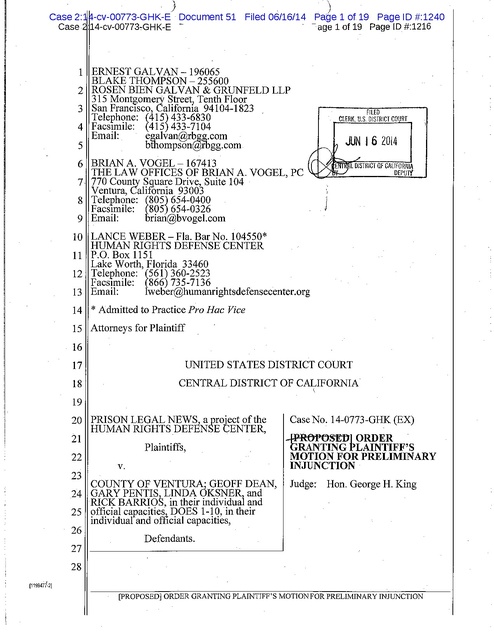 Prison Legal News v. Ventura County, Order Granting Preliminary Injunction 2014