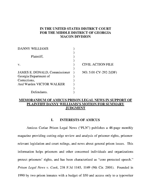 PLN Amicus Brief, Williams v. Donald, US District Court case, Georgia DOC ban on internet downloads, 2005