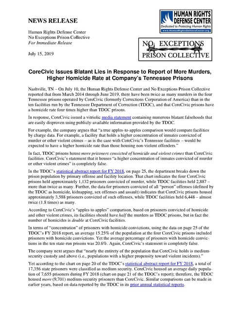 Nashville, TN – On July 10, the Human Rights Defense Center and No Exceptions Prison Collective reported that from March 2014 through June 2019, there have been twice as many murders in the four Tennessee prisons operated by CoreCivic (formerly Corrections Corporation of America) than in the ten facilities run by the Tennessee Department of Correction (TDOC), and that CoreCivic prisons have a homicide rate four times higher than TDOC prisons.